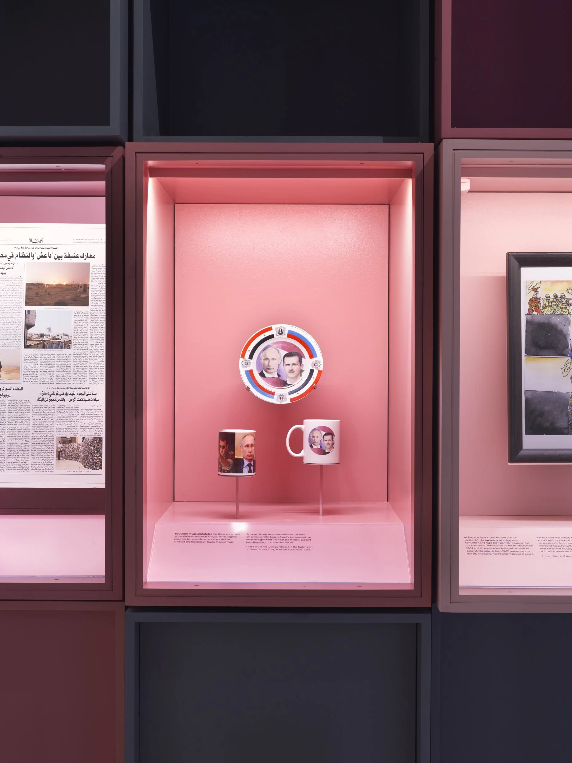 The Story of a Conflict exhibition was divided by an imposing wall structure, composed of open boxes recalling the residential buildings of Aleppo, bombed and broken by the conflict. The wall contained objects collected to represent the different sides of the conflict from a child’s life-vest to a bullet-damaged Aleppo street sign. Beyond the wall a multilayer AV installation explained the complexity of the war and factions involved. The symbolic graphic motif of a traditional Islamic pattern, broken apart and Damask pinks were used throughout.
